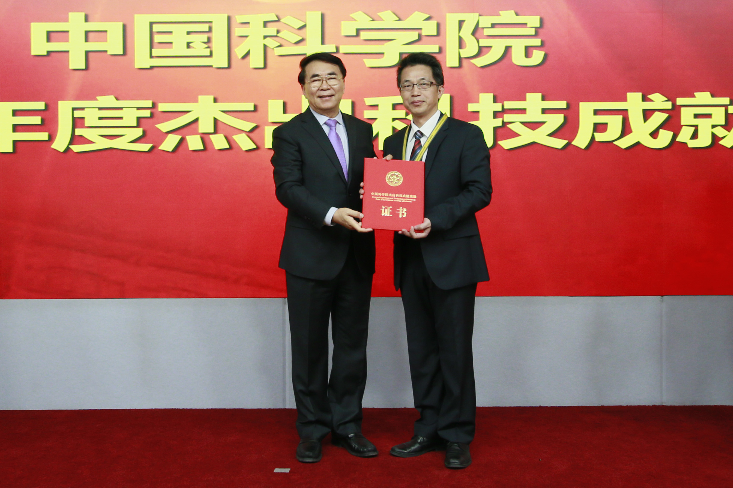 白春禮(左)為光電成像精確導引技術研究集體頒獎,史澤林代表領獎