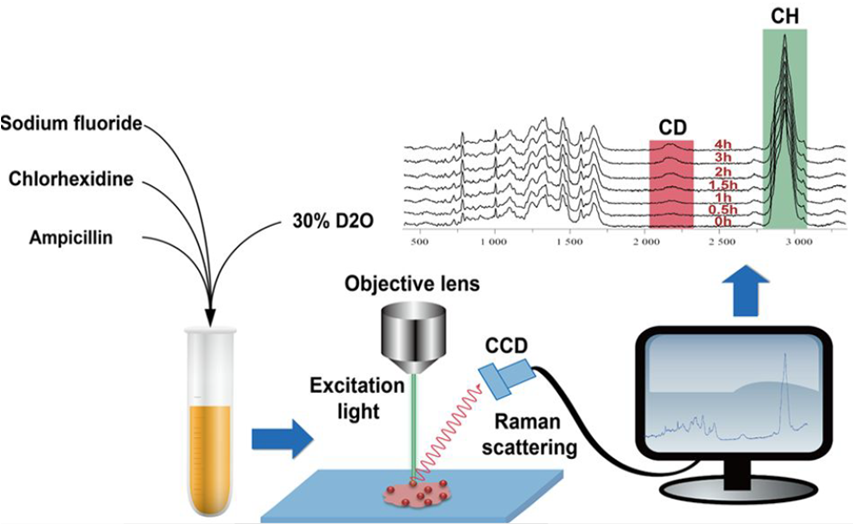 圖1. 基于重水標記單細胞拉曼成像的藥物抗菌效果評價技術示意圖