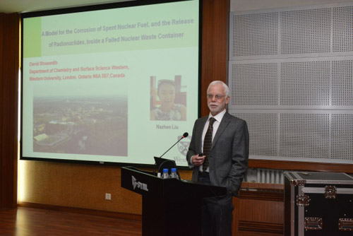 來訪期間,David Shoesmith博士為金屬所科研人員和研究生作了題目為“A MODEL FOR THE CORROSION OF SPENT NUCLEAR FUEL, AND THE RELEASE OF RADIONUCLIDES, INSIDE A FAILED WASTE CONTAINER”的李薰獎報告。報告前,張哲峰副所長代表金屬所為David Shoesmith博士頒發了李薰講座獎獎牌。頒獎儀式和報告由韓恩厚研究員主持。報告得到了金屬所科研人員和研究生的熱烈歡迎,聽眾紛紛踴躍提問,就感興趣的問題與David Shoesmith博士進行討論。來訪期間,David Shoesmith博士與金屬所科研人員和研究生進行了深入交流,并參觀了沈陽材料科學國家(聯合)實驗室。
