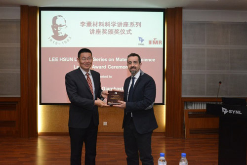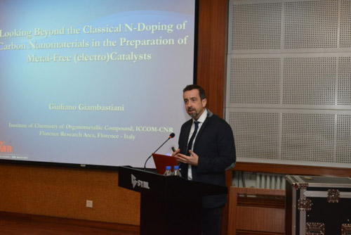來訪期間,GIAMBASTIANI Giuliano教授為金屬所科研人員和研究生作了題目為“Looking Beyond the Classical N-Doping of Carbon Nanomaterials in the Preparation of Metal-Free (electro) Catalysts”的李薰獎報告。報告前,張健副所長代表金屬所為GIAMBASTIANI教授頒發了李薰講座獎獎牌。頒獎儀式和報告由蘇黨生研究員主持。報告得到了金屬所科研人員和研究生的熱烈歡迎,聽眾紛紛踴躍提問,就感興趣的問題與GIAMBASTIANI教授進行討論。來訪期間,GIAMBASTIANI Giuliano教授與金屬所科研人員和研究生進行了深入交流。