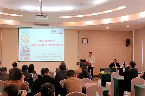 朱慶軍高級工程師首先介紹了中國工程院重大咨詢項目“我國腐蝕狀況及控制戰略研究”的項目背景和研究結果,以及國家海洋腐蝕防護工程技術研究中心的新技術,建議將基礎設施及重大裝備腐蝕防護安全納入煙臺市長遠規劃,提高防腐蝕意識。王建華助理研究員介紹了煙臺市腐蝕調查情況,李言濤研究員介紹了海洋腐蝕評價檢測技術,兩家院士工作站也分別介紹了合作研發的防腐新材料。