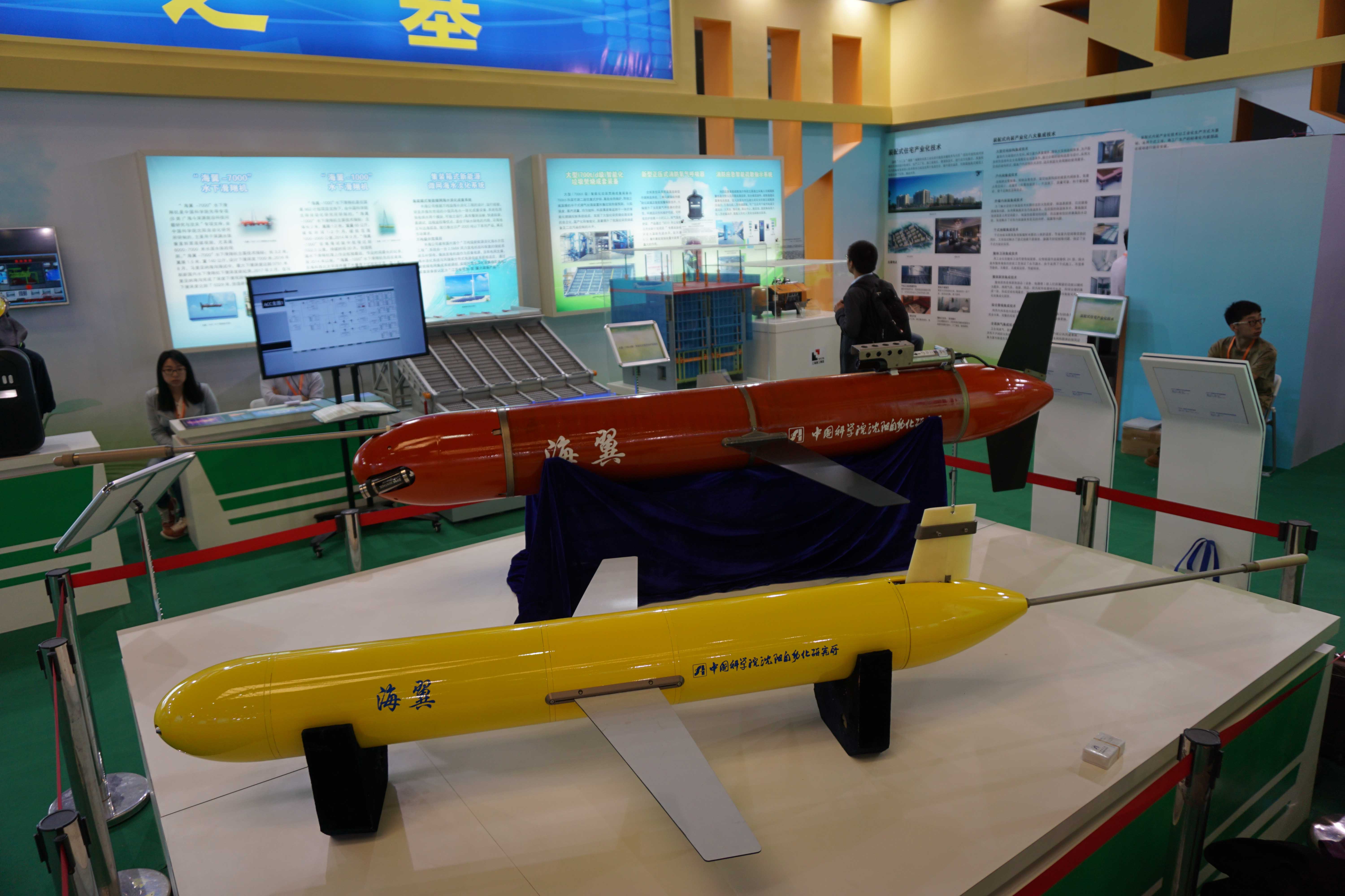 上交會(huì)上展出的“海翼”7000米級和1000米級水下滑翔機(jī)