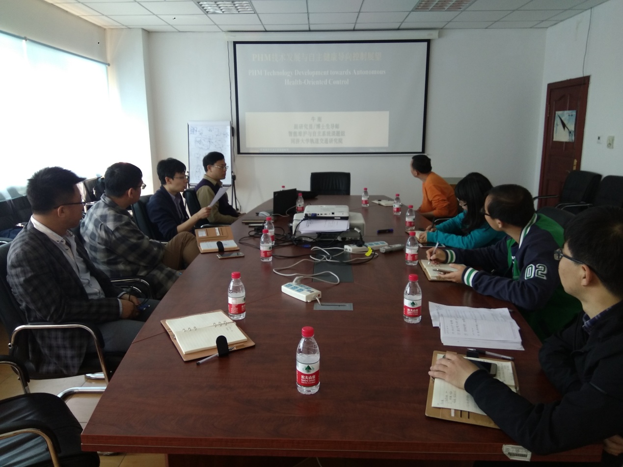 來訪期間,牛剛作了題為《故障預測與健康管理(PHM)技術發展與自主健康導向控制展望》的學術報告。他介紹了裝備健康管理技術的發展脈絡、PHM技術體系、設計與開發流程和代表性案例。他以永磁同步列車牽引系統和電空混合制動系統為研究對象,介紹了基于PHM技術的自主健康導向控制發展方向。報告結束后,牛剛和與會人員就PHM在智能制造領域內的應用、設備預測性維護等問題進行了深入的交流。