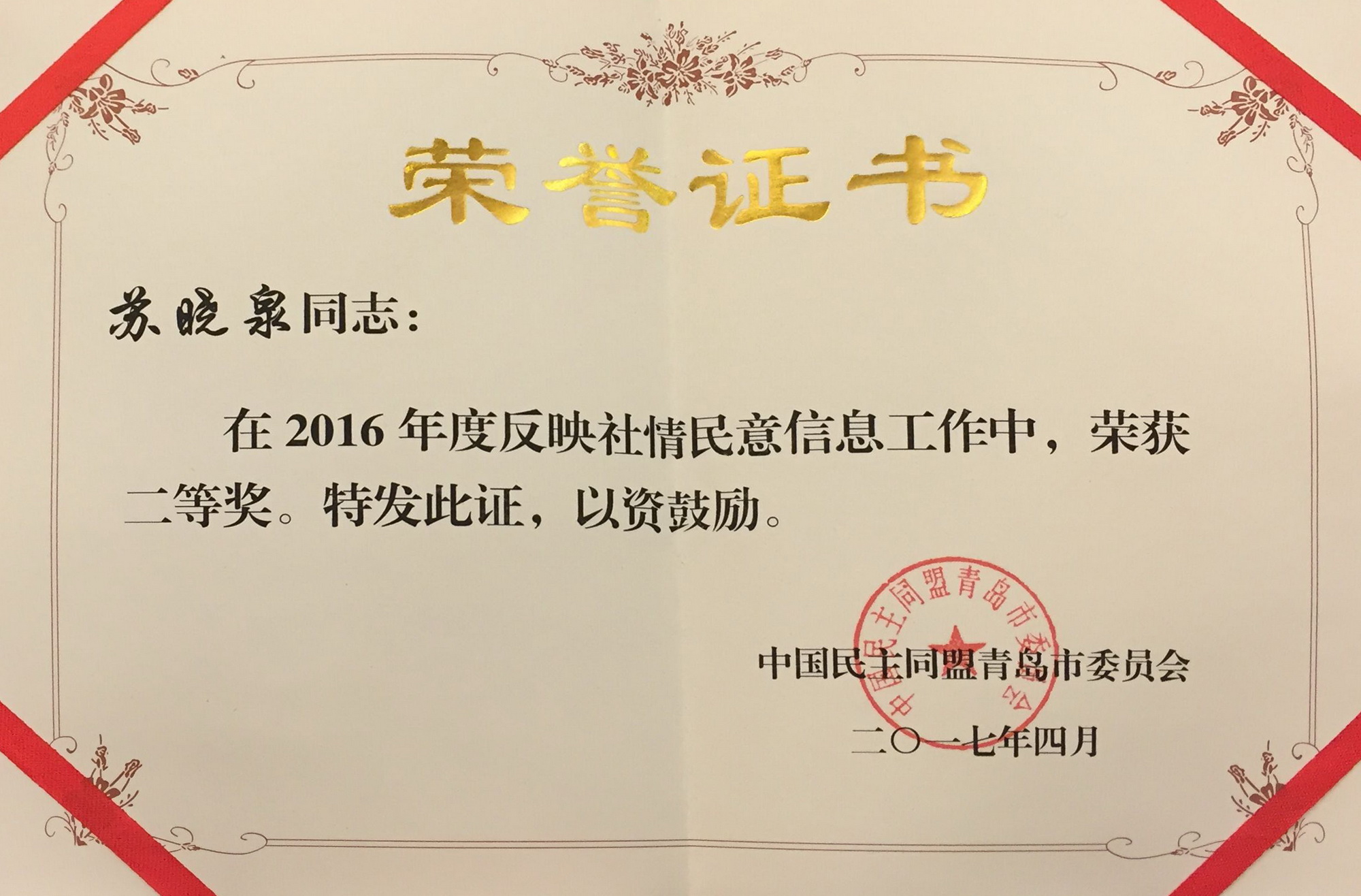 近日,民盟青島市委召開(kāi)了2017年參政議政工作會(huì)議,對(duì)2016年度參政議政工作和反映社情民意信息工作先進(jìn)集體、先進(jìn)個(gè)人作出表彰,青島能源所蘇曉泉榮獲民盟青島市委2016年度反映社情民意信息工作先進(jìn)個(gè)人二等獎(jiǎng)。