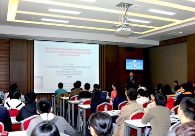 范良士主要介紹了金屬氧化物材料在能源利用過程中的應用,展示了如何將基礎研究的發現適用于實際的過程和方法。他詳細介紹了如何采用金屬氧化物復合顆粒作為氧載體,采用新型的化學鏈技術,將化石原料轉化為氫氣、合成氣、化學品和液體燃料,特別是如何采用流態化技術,指導化學鏈技術平臺的設計、放大以及反應器中試。報告會場氣氛十分活躍,多位科研人員和研究生與范良士進行了深入的交流和討論。