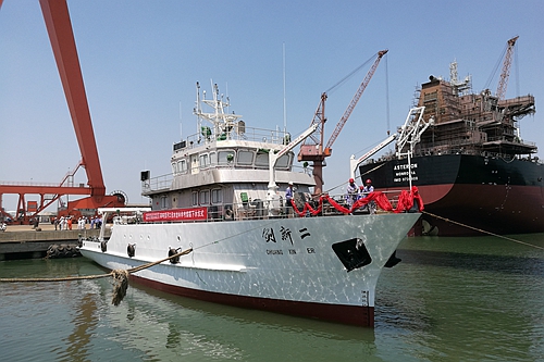 5月18日,中國科學(xué)院海洋研究所300噸級河口淺水型科學(xué)考察船“創(chuàng)新二”在山東蓬萊順利下水。海洋所黨委書記王輝、蓬萊市黨組成員王成海、中柏京魯船業(yè)有限公司董事長王轟等出席下水儀式。