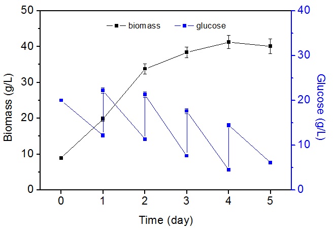 研究發現黃絲藻油脂中棕櫚油酸(C16:1 9)的含量占總脂肪酸的50%左右,遠高于其它常見微藻(Wang et al., 2016)。而棕櫚油酸(C16:1 9)屬于 -7單不飽和脂肪酸,除與 -3脂肪酸一樣具有促甘油三酯降低、有益心血管系統健康外,還被認為是一種新型荷爾蒙,能夠提高人體對胰島素的敏感性,在 型糖尿病的預防、保健和治療方面具有重要作用。研究發現黃絲藻可以利用有機碳源,特別是葡萄糖進行高密度異養生長的特性(Wang et al., 2017;Zhou et al., 2017),通過對培養基中有機碳、氮源和磷源及無機營養鹽的優化,建立了黃絲藻批式流加發酵工藝,最終生物量可達40g/L,油脂含量經誘導后可達干重的45%左右。該技術為建立利用黃絲藻異養發酵生產 -7脂肪酸并聯產生物柴油工藝奠定了基礎。相關技術申報了中國發明專利和國際PCT專利,已進入美國、日本、歐盟等國家的專利權申請。