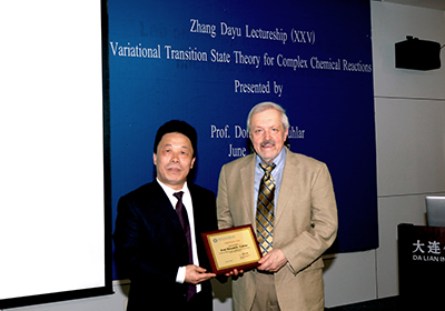 6月8日,美國科學院院士、美國明尼蘇達大學化學系的校董事講座教授Donald G. Truhlar應中國中科院大連化學物理研究所邀請,在生物樓學術報告廳做了題為“Variational Transition State Theory for Complex Chemical Reactions”的張大煜講座特邀學術報告。報告由分子反應動力學國家重點實驗主任張東輝研究員主持。副所長金玉奇代表大連化物所向Truhlar頒發了張大煜講座獎牌以及我所榮譽研究員證書。
