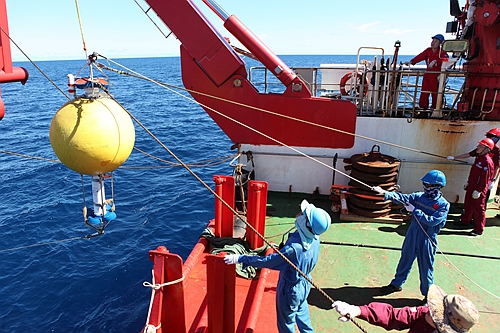 科研人員進(jìn)行潛標(biāo)主浮球入水作業(yè)