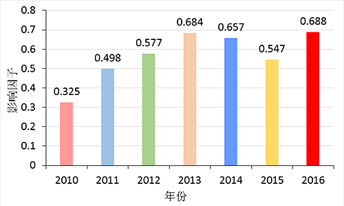 通過以上舉措,近年來CJOL期刊各項指標穩步提升。每年收稿約400篇,國際投稿約占20%(稿源來自20余個國家,包括一些發達國家的作者);期刊總體質量和各項指標穩步提升,影響因子總體增加;在中國科學院科學出版基金的期刊排行榜上名次顯著提升,連續三年獲得中國科學院出版基金二等獎;2012-2016年連續被評為“中國最具國際影響力學術期刊”,2014年、2016年先后兩次獲得中國科協“中國科技期刊國際影響力提升計劃”項目支持,累計支持經費225萬元。
