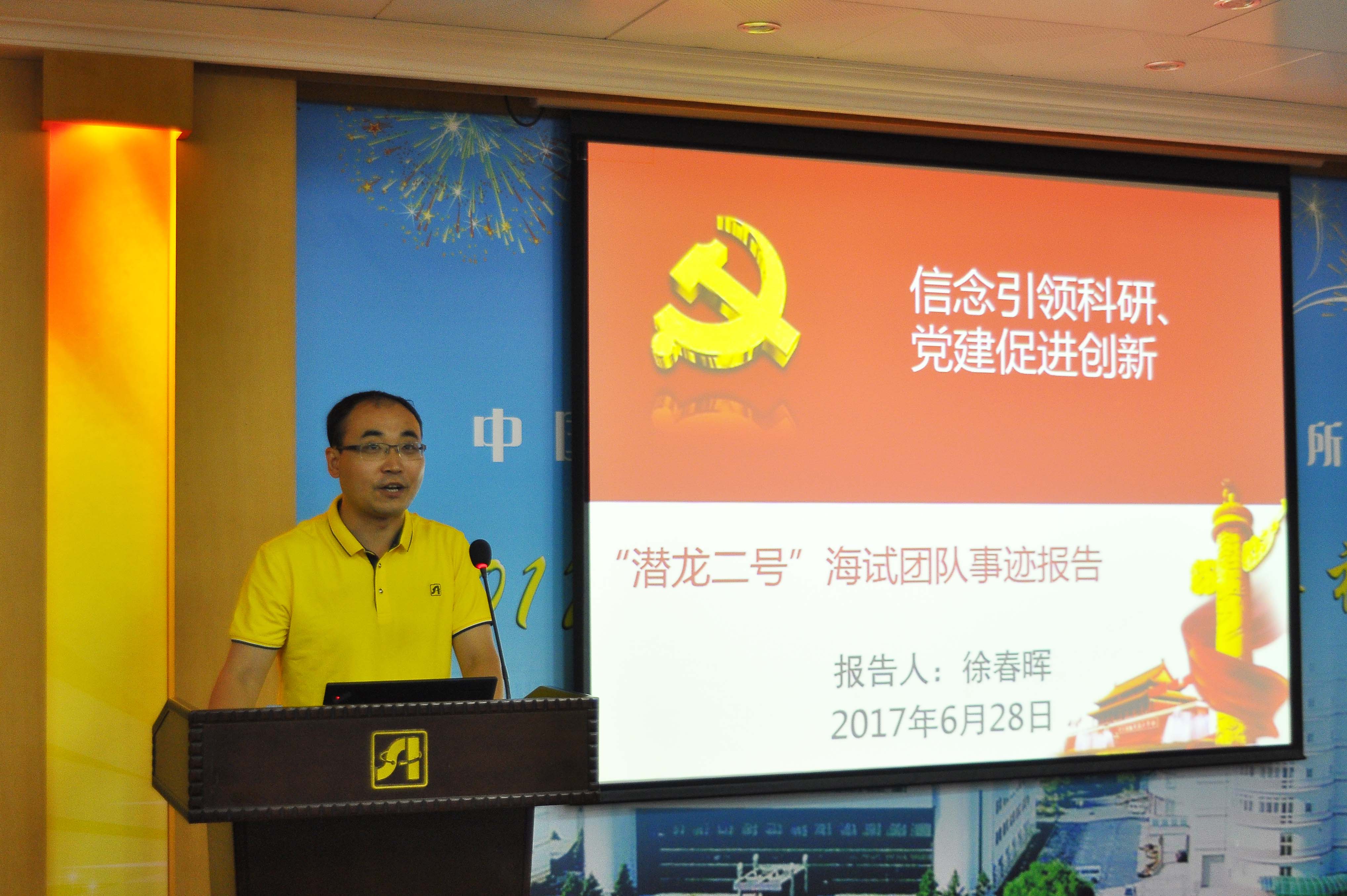 為深入貫徹黨的十八屆六中全會精神,推動“兩學(xué)一做”學(xué)習(xí)教育常態(tài)化制度化,中科院在全院黨員中開展了“信念引領(lǐng)科研、黨建促進(jìn)創(chuàng)新”主題交流研討活動,所黨委決定結(jié)合工作實(shí)際選樹典型,開展了主題事跡報告。水下機(jī)器人研究室副研究員徐春暉以《砥礪創(chuàng)新、潛龍?zhí)胶!窞轭},代表“潛龍二號”團(tuán)隊作了主題事跡報告。他講述了“潛龍二號”團(tuán)隊研發(fā)和試驗的歷程,通過一個個生動的事跡展現(xiàn)了團(tuán)隊中全體同志勇于拼搏、不畏艱辛、永不放棄、協(xié)作創(chuàng)新的崇高品質(zhì)。