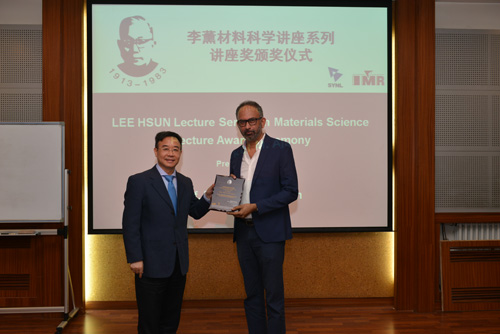 楊銳所長(zhǎng)為Pulickel M. Ajayan教授頒發(fā)李薰講座獎(jiǎng)獎(jiǎng)牌