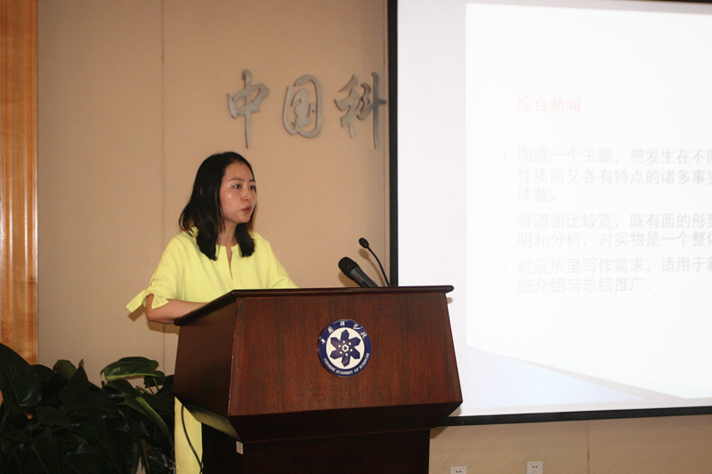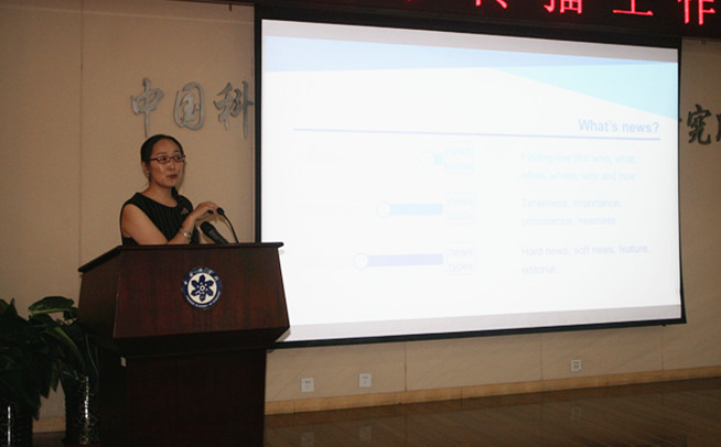 陳娜作了題為"On Science News Writing"的報告,以研究所科研進展英文宣傳稿為例,詳細介紹了英文宣傳稿寫作方式和要求,現場指導科研人員如何運用倒金字塔的寫作技巧寫出重點突出、簡潔明了、吸引受眾“眼球”的新聞稿。