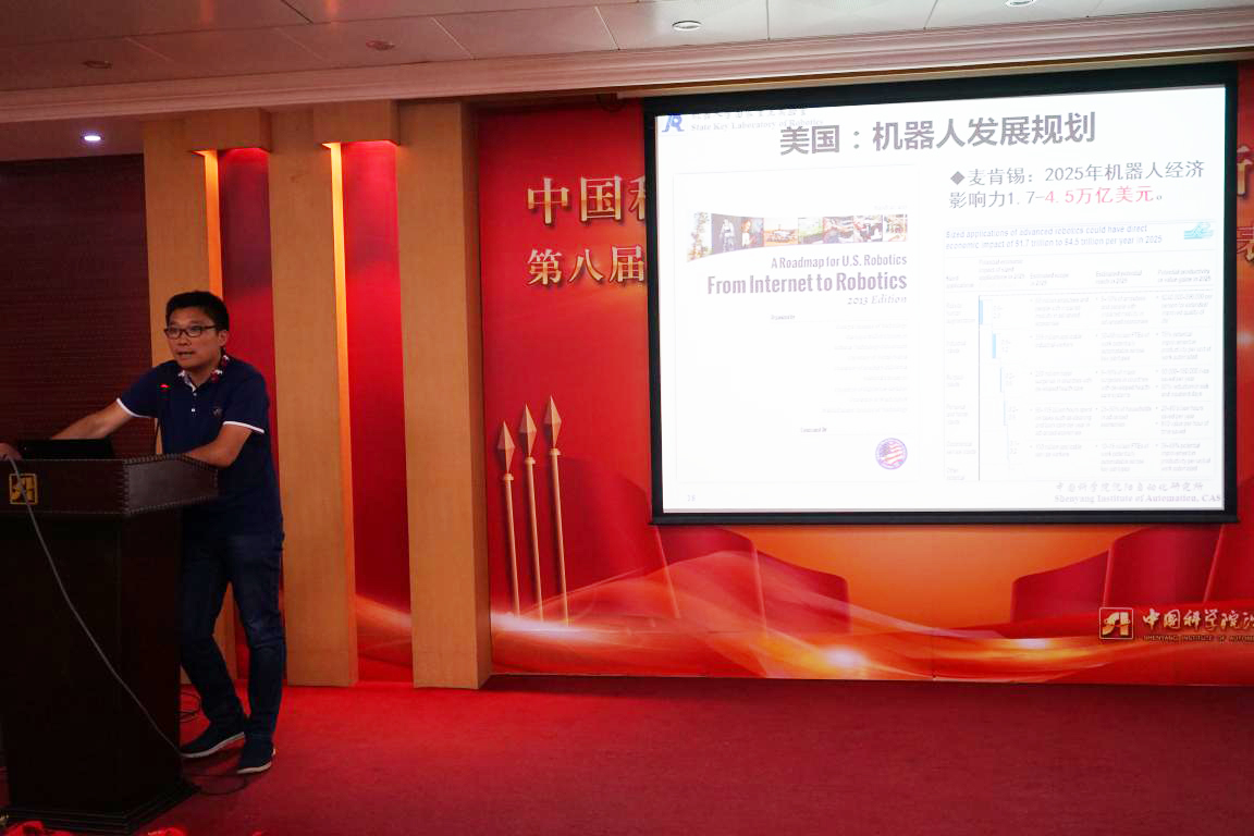 隨后,沈陽自動化所何玉慶研究員為大學生們作了題為《機器人發展簡史》的報告。他在報告中介紹了機器人的誕生、建立和發展歷程,重點介紹了沈陽自動化所機器人的發展之路,并介紹了旋翼無人機最新的科研方向和成果。報告會結束后,何玉慶就同學們關心的學術問題進行了討論與解答。
