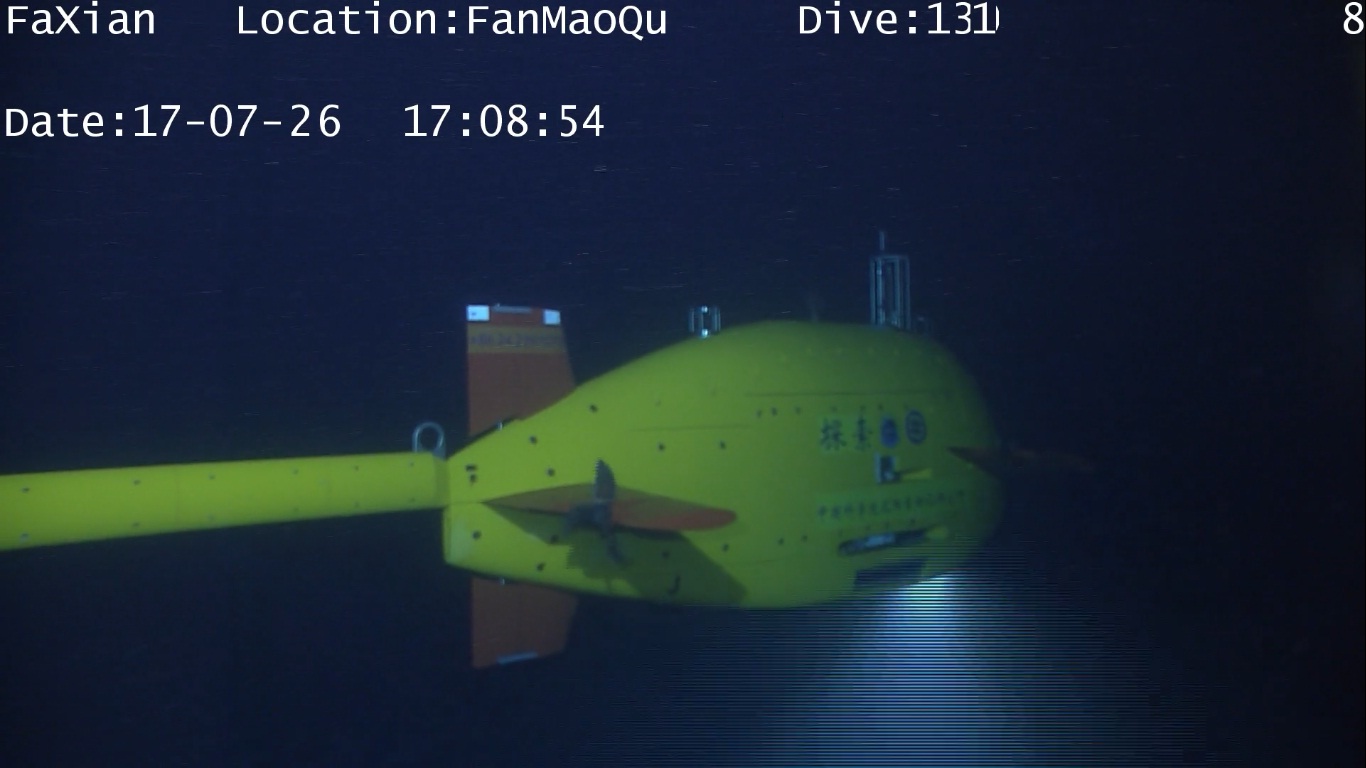 在前期工作的基礎上,本航段還同步實現了多臺探測設備的協同探測與作業及交匯拍攝。首先布放“探索”號AUV入水,在冷泉區預定水域進行光學探測作業;隨后,“科學”號科考船前往另一作業水域,布放“發現”號ROV入水,利用搭載在ROV平臺上的拉曼光譜探測系統對海底冷泉區天然氣水合物、冷泉生物群落和沉積物孔隙水等進行原位和定量分析。在“探索”號AUV完成指定區域的調查任務后,自主航行至“科學”號科考船作業區域。在“科學”船和“發現”號ROV的精準協同配合下,讓科學家第一次看到了AUV在海底的工作狀態,在我國首次實現了兩種不同類型的水下機器人近距離交匯拍攝。