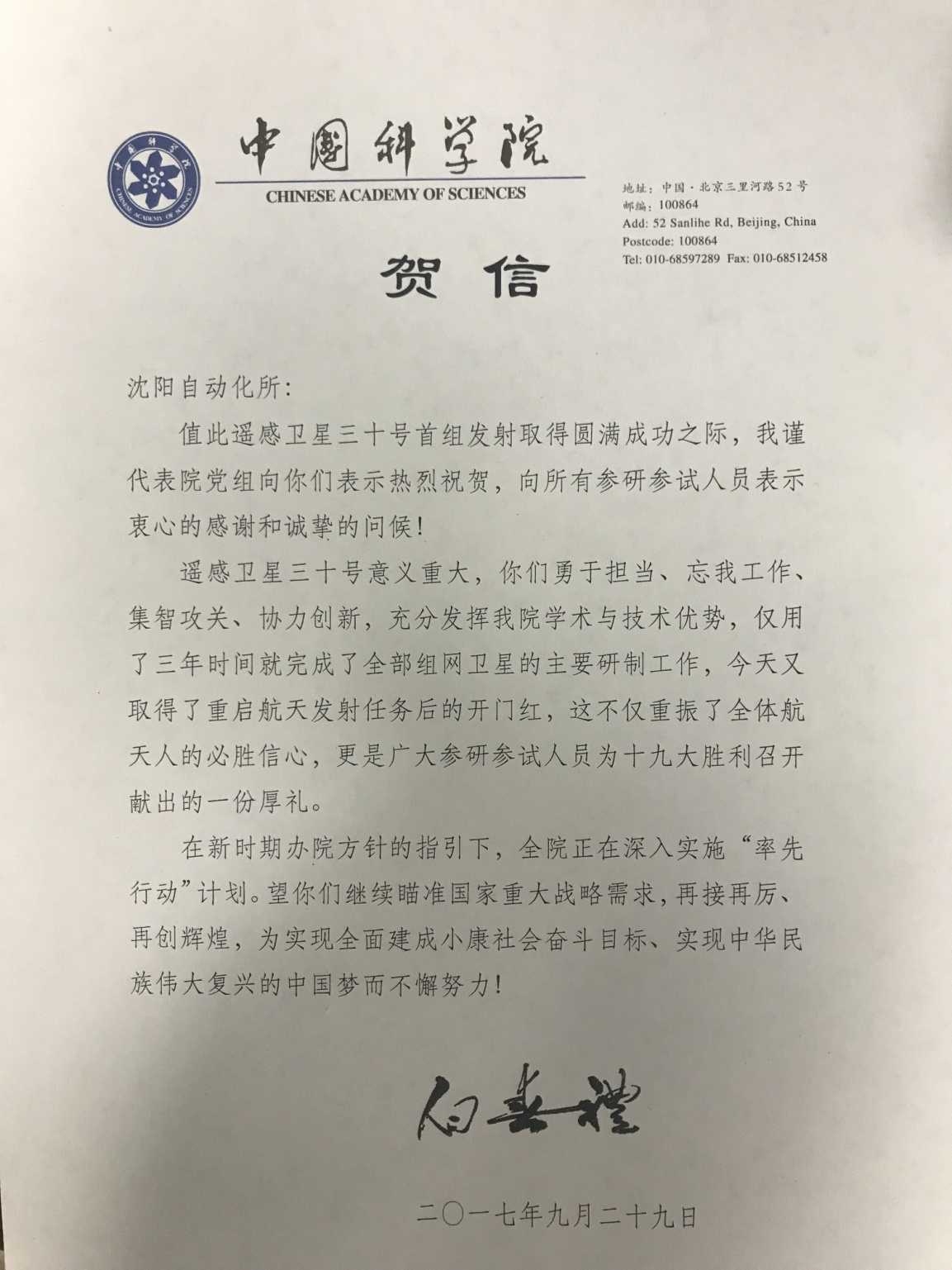 遙感三十號衛星由中國科學院微小衛星創新研究院作為總體單位研制,用多星組網模式開展電磁環境探測及相關技術試驗,具有重要意義。沈陽自動化所承擔遙感三十號衛星關鍵部件“太陽電池陣及其展開系統”的研制工作。項目組成員自承擔任務以來,勇于擔當、忘我工作、集智攻關、協力創新,充分發揮研究所的人才技術優勢和組織管理能力,按進度、按質量完成了多套高可靠、高剛度、輕量化太陽電池陣及其展開系統產品的研制。9月29日,01組衛星星箭分離之后,沈陽自動化所承研的太陽電池陣順利展開,標志著衛星太陽電池陣及其展開系統發射圓滿成功,也標志著中國科學院自此具有自主研制衛星太陽電池陣及其展開系統的能力。太陽電池陣及其展開系統的成功研制不僅增強了全所航天人的必勝信心,更為十九大勝利召開獻上了一份厚禮,同時也為研究所后續衛星配套產品批量生產、試驗、管理等方面積累了重要經驗。