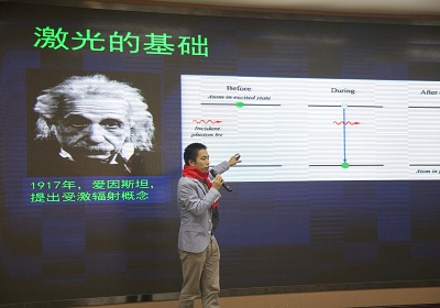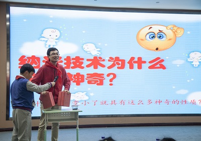 啟動儀式后,大連化物所分子反應動力學國家重點實驗室研究員肖春雷和催化基礎國家重點實驗室博士生周質文分別圍繞“神奇的激光”和“納米技術”,用生動有趣的表達方式、通俗易懂的表現形式,將“高大上”的科學研究變身成“接地氣”的身邊常識,緊緊地吸引著在場每一個孩子的眼球。肖春雷利用視頻和動畫等形象地講述了神通廣大的激光與我們平時生活的息息相關,周質文則通過現場演示等方式,將孩子們帶入了肉眼看不到的神秘奇特的納米微觀世界。現場熱烈的互動,真切地表達了孩子們對科學的好奇和對兩位老師的肯定。