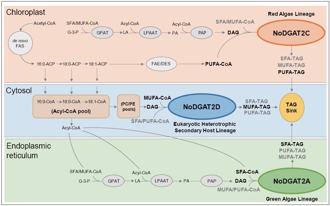 單細(xì)胞中心等前期發(fā)現(xiàn),在海洋微擬球藻基因組中編碼有多達(dá)11個II型二酰甘油酰基轉(zhuǎn)移酶編碼基因(DGAT2),它們催化甘油三酯合成中的最后一步也是關(guān)鍵一步。動物和高等植物中常常只有1-2個DGAT2,為何海洋微擬球藻具有超出已知所有物種的DGAT2家庭成員數(shù)目呢?為了解答上述問題,研究人員通過在酵母中的表達(dá)與功能分析、在體外的酶活鑒定、進(jìn)而在微擬球藻中的過表達(dá)與基因敲低等層層深入的實(shí)驗(yàn)策略,發(fā)現(xiàn)其中DGAT2A、DGAT2D與DGAT2C 具有TAG合成酶活性,而且這三個DGAT2家庭成員分別偏好飽和、單不飽和和多不飽和的脂酰CoA底物。基于此,研究人員提出了比前期工作(Li, et al, Plant Cell, 2014)深入了一大步的油脂合成機(jī)制模型,認(rèn)為其中分別來自于三個不同祖先的DGAT2A、DGAT2D與DGAT2C,在長期的共進(jìn)化過程中,形成了迥異卻互補(bǔ)的底物偏好性,而且在TAG合成的流水線上進(jìn)行著精妙的功能分工與時空協(xié)作(圖一)。