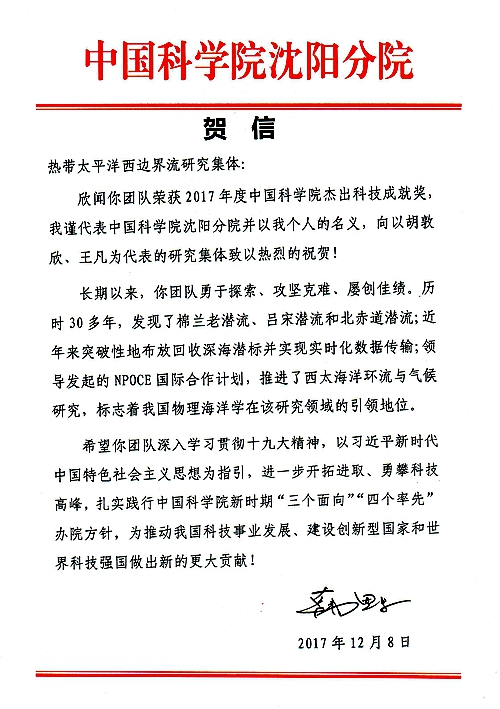 日前,中國科學院海洋研究所“熱帶太平洋西邊界流研究集體”榮獲2017年度中國科學院杰出科技成就獎。中國科學院沈陽分院院長韓恩厚致信海洋研究所,向以胡敦欣、王凡為代表的研究集體表示祝賀。