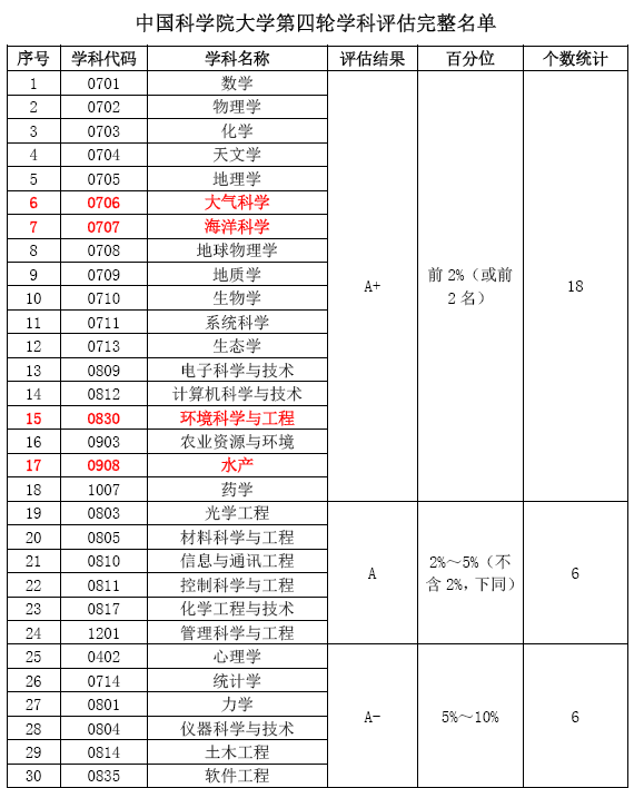 近日,教育部學位與研究生教育發展中心公布了全國第四輪學科評估結果。中國科學院大學共有48個一級學科參評,其中30個學科被評為優秀(A類),18個學科被評為A+,6個被評為A,6個被評為A-,總成績僅次于北大、清華,名列全國第三。