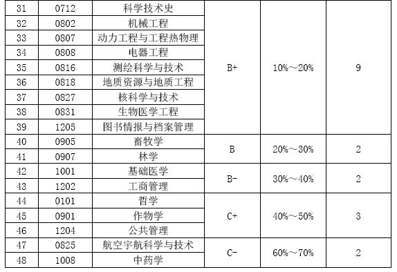 與前幾輪學科評估不同的是,本輪學科評估結果采用按百分位進行分檔的方式,根據“學科整體水平得分”的位次百分位,將前70%的學科分為9檔公布,不公布分數且不排具體名次,僅公布排位前70%的學科。其中,前2%(或前2名)為A+,2%~5%為A(不含2%,下同),5%~10%為A-,10%~20%為B+,20%~30%為B,30%~40%為B-,40%~50%為C+,50%~60%為C,60%~70%為C-。