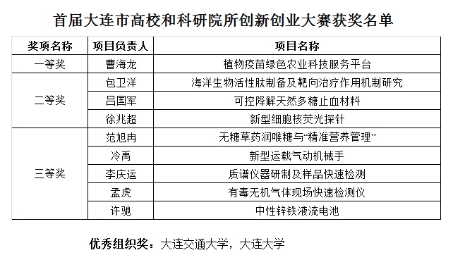 本次雙創大賽由大連市人民政府主辦,大連化物所和大連知你創業基地共同承辦,大賽歷時近6個月,經過了策劃、啟動、報名、初審、培訓、初賽、決賽等環節。通過在大連市的廣泛宣傳及相關高校的支持,共有來自我市6所高校和大連化物所的近40個項目報名參加本次大賽,涵蓋化工新材料、生物醫藥、智能制造等多個領域。在大賽舉辦過程中,始終貫徹“把大賽做出成效”的精神,秉承“過程重于結果”的工作理念,大賽組委會圍繞大賽舉辦多場培訓、專家指導、投資機構對接等活動,切實為提升大連化物所及大連高校參賽人員的創新創業能力,營造創新創業氛圍,支撐國家雙創示范基地建設,起到了積極的作用。目前已經有3個獲獎項目開始與企業或投資機構進行合作洽談。