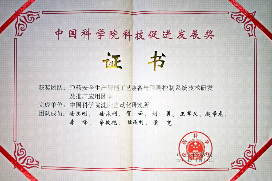 1月23日,在北京召開的中國科學院2018年度工作會議上,中國科學院沈陽自動化研究所“彈藥智能制造成套裝備科研團隊”獲得2017年度中國科學院科技促進發展獎表彰。中科院院長、黨組書記白春禮為獲獎者頒獎,沈陽自動化所徐志剛研究員代表團隊領獎。