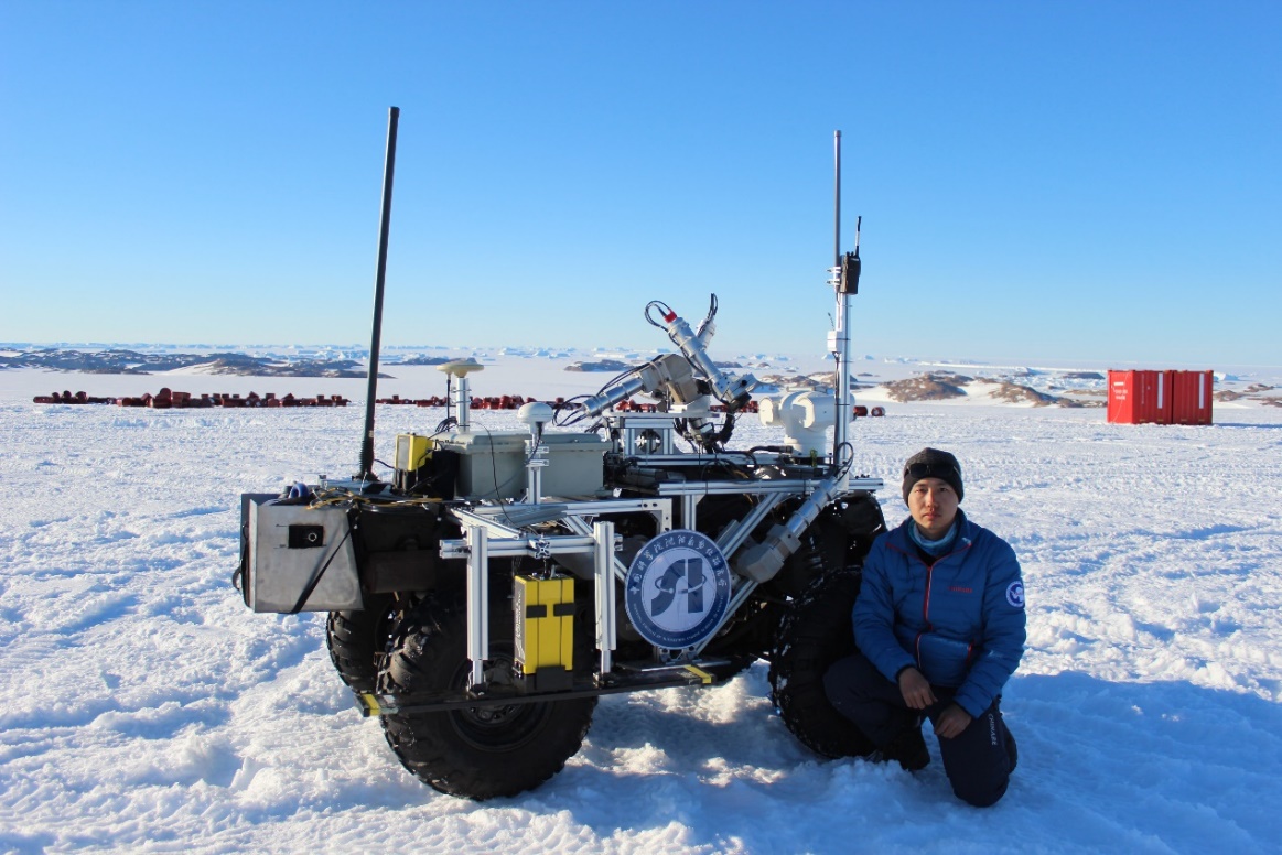 機(jī)器人學(xué)研究室眭晉在中山站內(nèi)陸出發(fā)基地與探冰機(jī)器人合影
