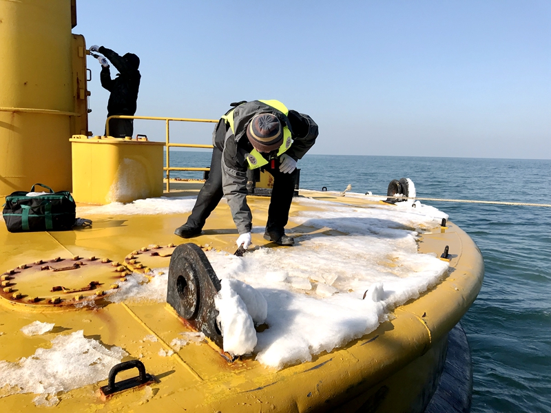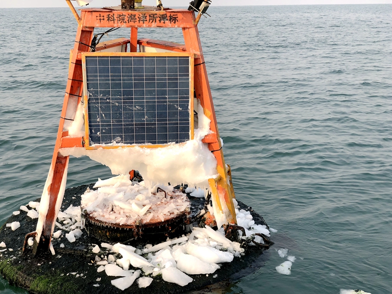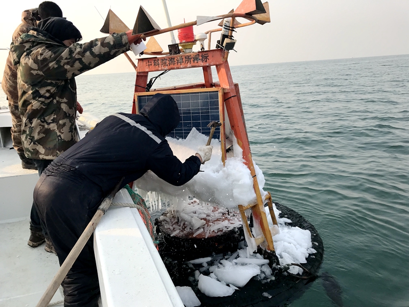為保證春節期間近海觀測網絡黃海站、東海站海上觀測設施的安全穩定運行,公共技術中心組織技術人員假期之前對在位運行的觀測浮標系統進行了全面系統的巡檢和維護。由于今冬寒潮頻發,海上冰情嚴重,技術人員重點對北黃海海域和山東外海海域的浮標進行了除冰工作,以消除結冰對浮標供電系統的影響。