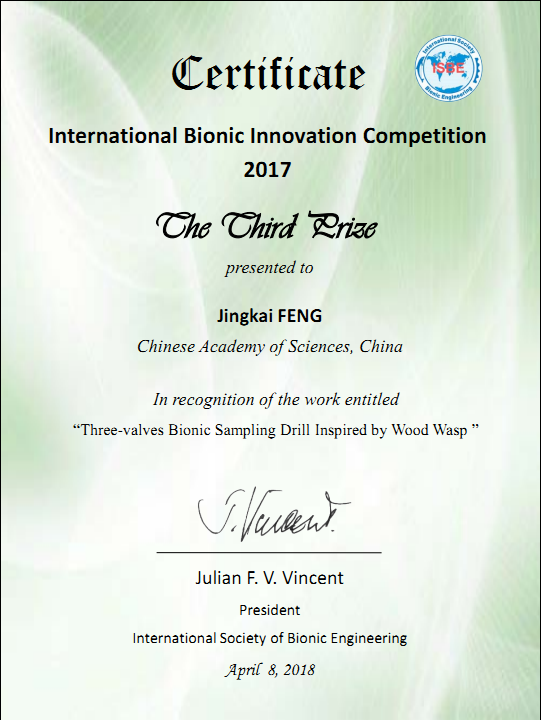 近日,國際仿生工程學會(International Society of Bionic Engineering)首屆研究生仿生創新大賽評選結果揭曉,中國科學院沈陽自動化研究所研究生馮靖凱參賽作品Three-valves Bionic Sampling Drill Inspired by Wood Wasp獲三等獎。