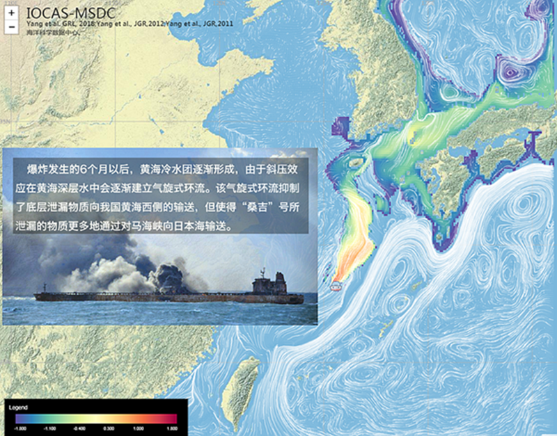“桑吉”號溢油擴散路徑數據可視化是海洋科學大數據中心結合中科院海洋環流與波動重點實驗室高分辨海流模式數據,采用Leaflet交互式地圖引擎技術,展示科學家通過對西北太平洋海域的水動力環境進行數值模擬所預測得到的“桑吉”號泄露物質可能的擴散和遷移軌跡。