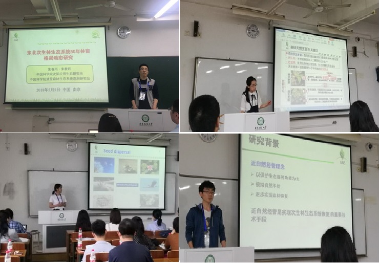5月5日上午,宋立寧副研究員主持全國生態學研究生論壇“森林生態系統與管理”分會場,博士研究生王靜、盧德亮、張婷在此分會場分別做題為“動物傳播胡桃楸種子對落葉松人工林林分結構變化的響應”、“基于林窗干擾的溫帶次生林生態系統近自然經營”、“林窗大小和林窗內位置對次生林主要闊葉樹種萌生更新的影響”口頭報告;博士研究生朱春雨在“生態遙感與應用”分會場做題為“東北次生林生態系統50年林窗格局動態研究”口頭報告。