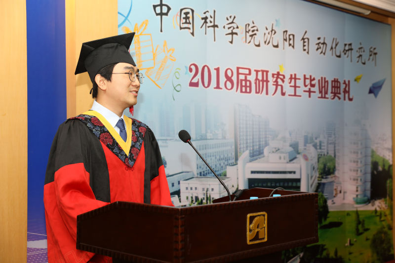 隨后,2018屆博士研究生施佳林代表畢業(yè)生發(fā)言。他回顧了在沈陽自動(dòng)化所度過的學(xué)生歲月,表示在能畢業(yè)時(shí)見證研究所的甲子華誕感到無比的自豪和驕傲,他由衷的感謝每一位導(dǎo)師對(duì)自己的悉心培養(yǎng)和關(guān)懷,并真誠(chéng)祝愿沈陽自動(dòng)化所越來越好。