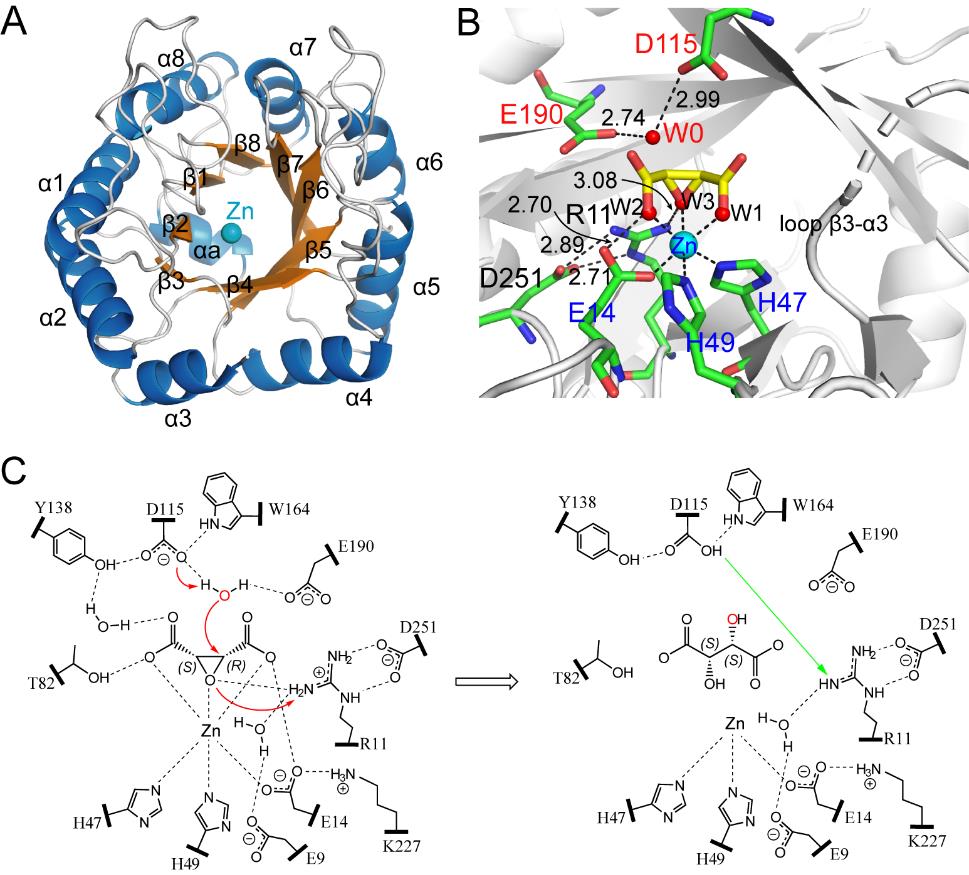 圖1 產D(-)酒石酸的順式環氧琥珀酸水解酶CESH[D]的結構與催化機制。(A)CESH[D]的整體結構。(B)CESH[D]的活性位點結構及推測的底物結合模式。(C)根據結構分析推斷的催化機制。