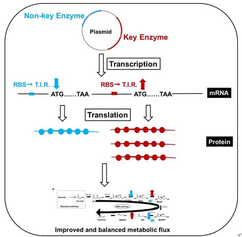 青島能源所生物基材料組群張海波研究員帶領(lǐng)的精細(xì)化學(xué)品研究組長期致力于萜烯化合物的生物合成,重點針對MVA途徑的酶甲羥戊酸激酶(MK)、異戊烯焦磷酸異構(gòu)酶(IDI)和萜烯合成酶等幾個限制性點,同時統(tǒng)籌代謝流和中間產(chǎn)物毒性,平衡整條合成路線,在點線結(jié)合提升萜類化合物合成的MVA途徑的效率上取得了新的突破。首先,針對MVA途徑中的MK和IDI,通過不同物種來源篩選、隨機突變和半理性設(shè)計進(jìn)行定向進(jìn)化和優(yōu)化,獲得了酶活性提高的MK(RSC Advances, 2018)和IDI (Microbial Cell Factories, 2018),從而減弱代謝流在MK和IDI位點的阻滯,最終提高萜烯化合物的產(chǎn)量(圖1 MK的定向進(jìn)化策略和效果圖)。其次,統(tǒng)籌MVA途徑涉及到的多步反應(yīng),對酶表達(dá)量的調(diào)控涉及的多個水平。該研究選取翻譯水平上的調(diào)控方法,避免了RNA的不穩(wěn)定和翻譯后水平調(diào)控的菌體代謝負(fù)擔(dān)問題,通過調(diào)整不同酶的核糖體結(jié)合位點(RBS)序列的手段,調(diào)控不同酶的表達(dá),平衡整條代謝路線。對非限制酶羥甲基戊二酰輔酶A還原酶基因(MvaE)和甲羥戊酸焦磷酸脫羧酶基因(ERG19),調(diào)節(jié)其RBS序列,使其翻譯起始效率(T.I.R.)降低,降低其蛋白表達(dá)量。對限制性酶MK和IDI,調(diào)節(jié)其RBS序列,使其T.I.R.提高,提高其蛋白表達(dá)量。通過對甲羥戊酸途徑中的不同的酶的蛋白表達(dá)量的調(diào)控,實現(xiàn)了代謝流的平衡,最終提高了萜烯化合物的產(chǎn)量(圖2 非限制酶和限制酶RBS序列優(yōu)化策略)。
