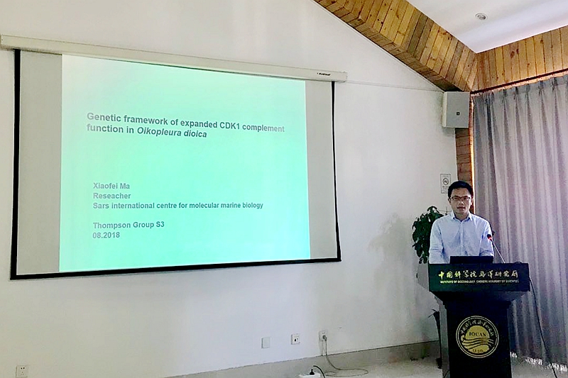 在SARS國際海洋生物分子生物學中心從事博士后研究工作的馬曉飛,主要從事無脊椎動物Oikopleura dioca的細胞周期調控研究。他的報告題目是“Genetic framework of expanded CDK1 complement function in Oikopleura dioica”,介紹了其發現的Oikopleura CDK1獨特基因duplication,其paralogs在正達爾文選擇壓力下發生特化以促進快速胚胎分裂與發育。