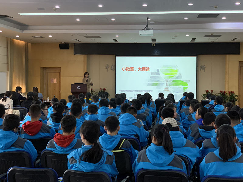 在科普報告環(huán)節(jié)中,崔光磊研究員為學生們通俗闡述了新能源的相關(guān)知識,并結(jié)合固態(tài)鋰電池在新能源汽車、深海大洋探索中的實際應(yīng)用例子,講解新能源未來應(yīng)用的廣闊空間。汪輝副研究員以“小微藻大用途”為主題介紹了微藻的魅力,作為生物質(zhì)能源的一種,微藻可以對二氧化碳進行固定,達到固碳減排的效果;微藻還具有趨光性,《最強大腦》曾用微藻表現(xiàn)藝術(shù)的動態(tài)變化,呈現(xiàn)出惟妙惟肖的畫作。