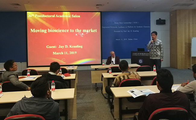 3月11日上午,中國科學院大連化學物理研究所第三十六期博士后學術沙龍在生物樓學術報告廳舉行,本期沙龍主題是“Moving Bioscience to the Market”,沙龍特邀微生物學專家伯克利加州大學Jay D. Keasling教授為做客嘉賓,大連化物所青年職工、博士后、研究生等20余人參加活動。