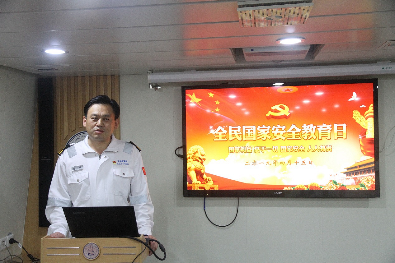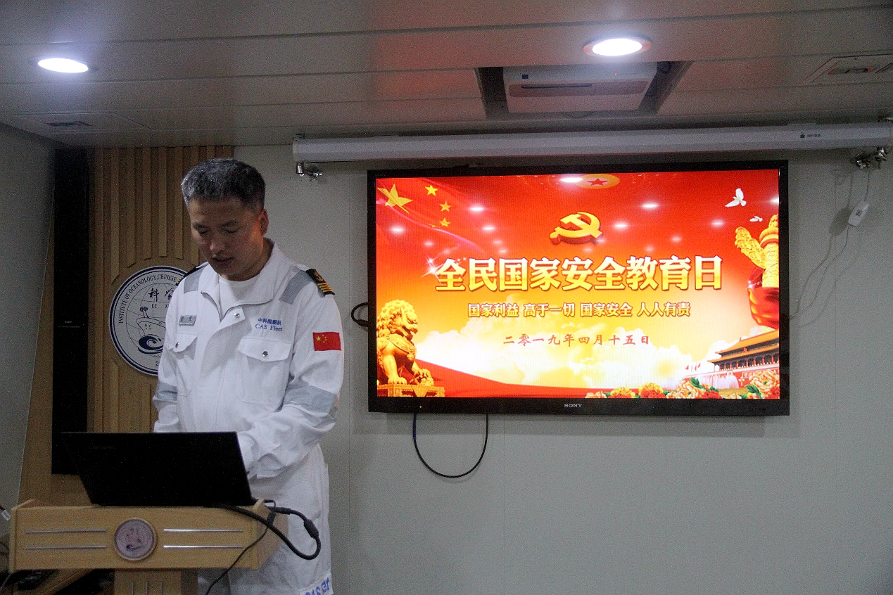 安而不忘危,存而不忘亡,治而不忘亂。4月15日,在第四個(gè)全民國(guó)家安全教育日到來之際,遠(yuǎn)在太平洋執(zhí)行科學(xué)考察任務(wù)的“科學(xué)”號(hào)利用作業(yè)間隙開展“維護(hù)國(guó)家安全人人有責(zé)”為主題的宣傳教育活動(dòng)。黨委委員、“海上堡壘”臨時(shí)黨支部書記李雷溪同志以“國(guó)家利益高于一切,國(guó)家安全人人有責(zé)”為題做專題教育講座。全船除在崗值班人員外全部參加學(xué)習(xí)活動(dòng),船長(zhǎng)陳修峰主持活動(dòng)。