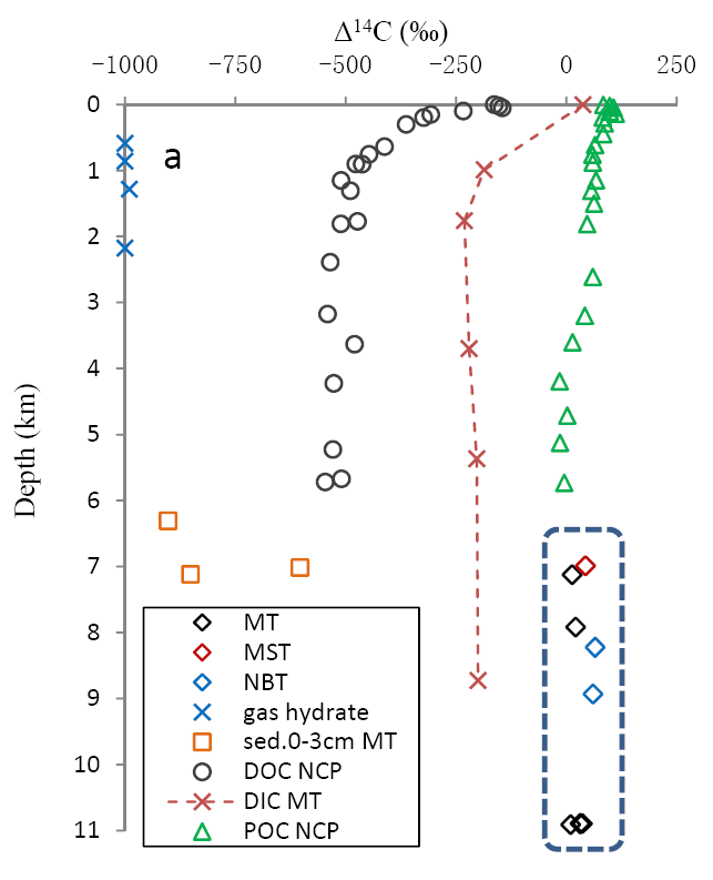 由于上世紀(jì)五六十年代的人為核試驗(yàn)影響,使大氣中的14C含量增加了一倍,從而導(dǎo)致現(xiàn)代大氣中的 14C>0‰,這部分增加的14C稱之為核爆14C。在海氣交換作用下,表層海水也具有了核爆14C信號(hào)( 14C>0‰)。但在深海,由于海水循環(huán)周期長和巨大的碳儲(chǔ)庫效應(yīng),海溝內(nèi)源性有機(jī)質(zhì)(如周圍海水溶解有機(jī)碳和沉積物有機(jī)質(zhì))的 14C<-450‰。地球內(nèi)部物質(zhì)則經(jīng)過了漫長埋藏和地質(zhì)作用時(shí)間,14C基本衰變耗盡, 14C接近-1000‰。