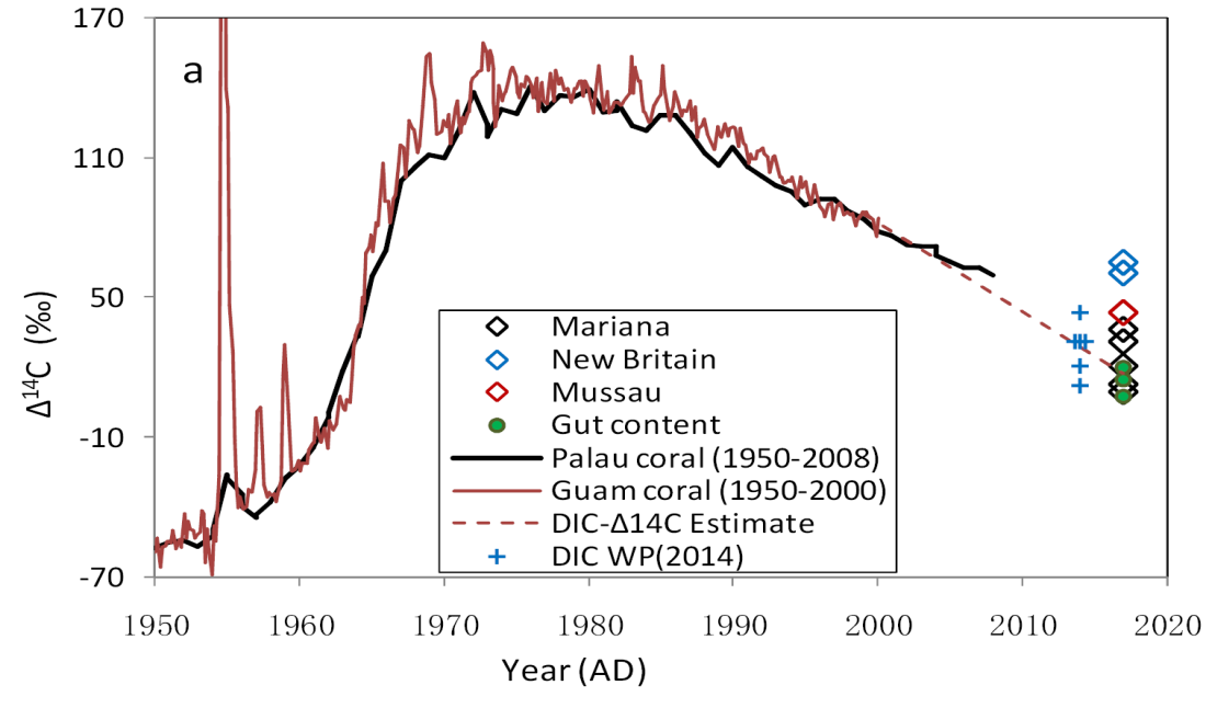 鉤蝦肌肉組織和腸內(nèi)容物 14C值(空心菱形和綠色圓點(diǎn))與海洋核爆14C曲線比較