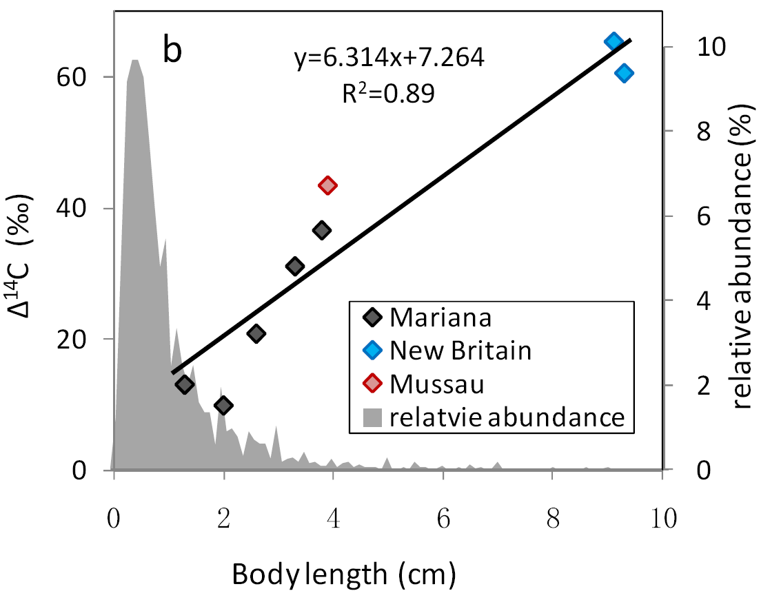 研究團(tuán)隊(duì)對(duì)來自西太平洋三個(gè)海溝(包括馬里亞納海溝)不同深度的鉤蝦有機(jī)組分進(jìn)行了14C示蹤研究,發(fā)現(xiàn)肌肉組織 14C變化范圍為10 2‰到65 2‰,與表層DIC和POC值接近,具有明顯的核爆14C特征;腸內(nèi)容物 14C值為7 2‰到20 2‰,與采樣時(shí)表層海水的 14C值十分接近,說明海溝底部鉤蝦幾乎完全依賴表層有機(jī)質(zhì)的輸送;海溝鉤蝦體長與肌肉組織的14C含量有很好的相關(guān)性,表明鉤蝦肌肉組織的14C含量可以指示鉤蝦的生長時(shí)間。利用海洋核爆14C曲線,可以得到本研究中鉤蝦樣品的最大表觀年齡為11.5 1.5 yr。考慮到測試對(duì)象的存活情況,海溝鉤蝦的實(shí)際壽命應(yīng)該大于11.5 1.5 yr,而淺海鉤蝦的壽命一般為1-2 yr,海溝鉤蝦的壽命顯著增長,可能與其低溫環(huán)境有關(guān)。