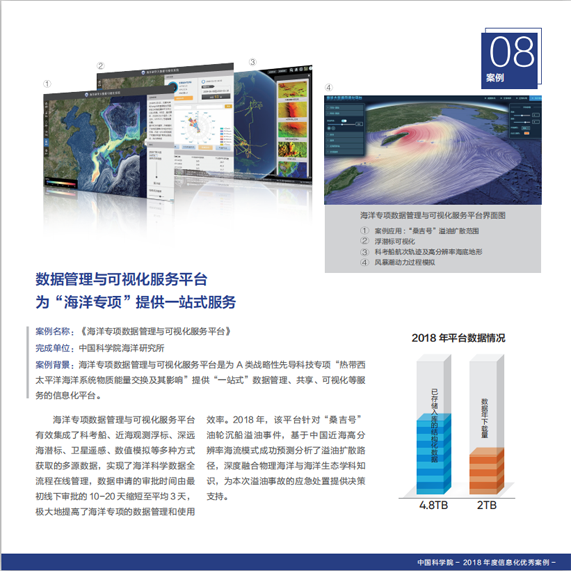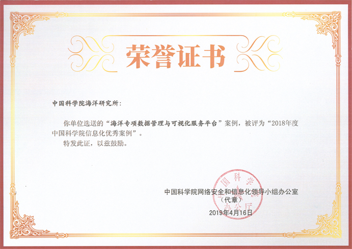 近日,中國科學院在全院范圍內開展科研信息化優秀應用案例評選工作,中科院海洋所海洋大數據中心設計研發的“海洋先導專項數據管理與可視化平臺”被評為2018年度中國科學院科研信息化優秀案例,并入選《中國科學院信息化年度報告(2018)》 。