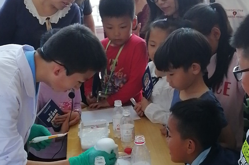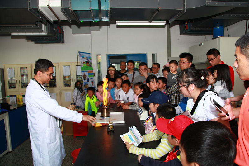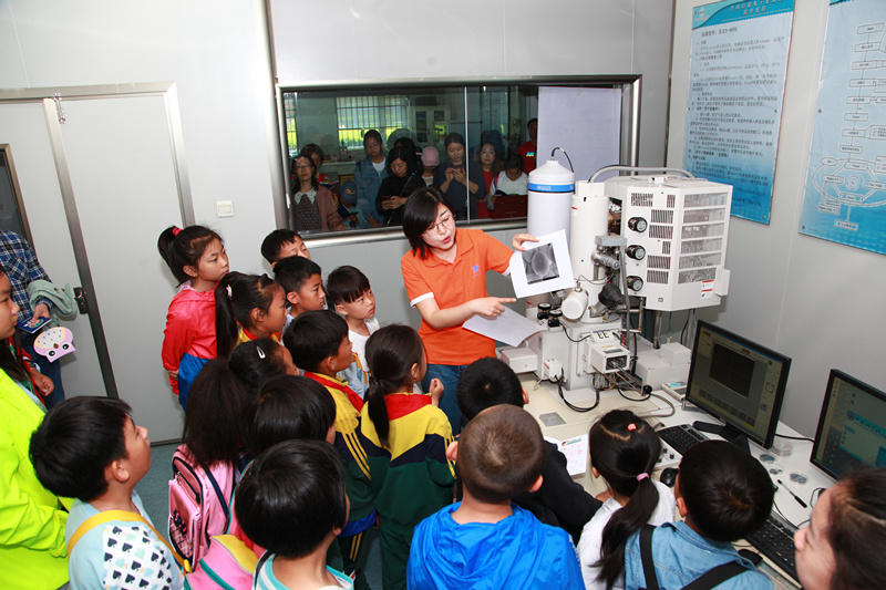 在大型儀器平臺,志愿者以實驗演示結合現場講解的形式,向公眾展示了氣相色譜與質譜聯用儀、液相色譜與質譜聯用儀、核磁共振波譜儀、X射線衍射、透射電鏡、原子力顯微鏡等九臺大型實驗儀器。使公眾從原子分子結構認識物質世界、從微觀形貌認識世界。例如參與活動的小朋友在掃描電鏡下觀察到了頭發毛鱗片結構以及納米顆粒,通過紅外光譜探索分子結構的奧秘,探測衣服面料的成分。