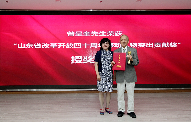 曲偉部長向曾院士家屬頒發“山東省改革開放四十周年感動人物突出貢獻獎”