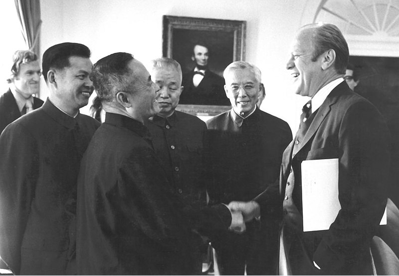 1975年7月以周培源(右2)為團長、曾呈奎(右4)為副團長的中國科學技術代表團訪美,美國總統福特(右1)在白宮接見代表團