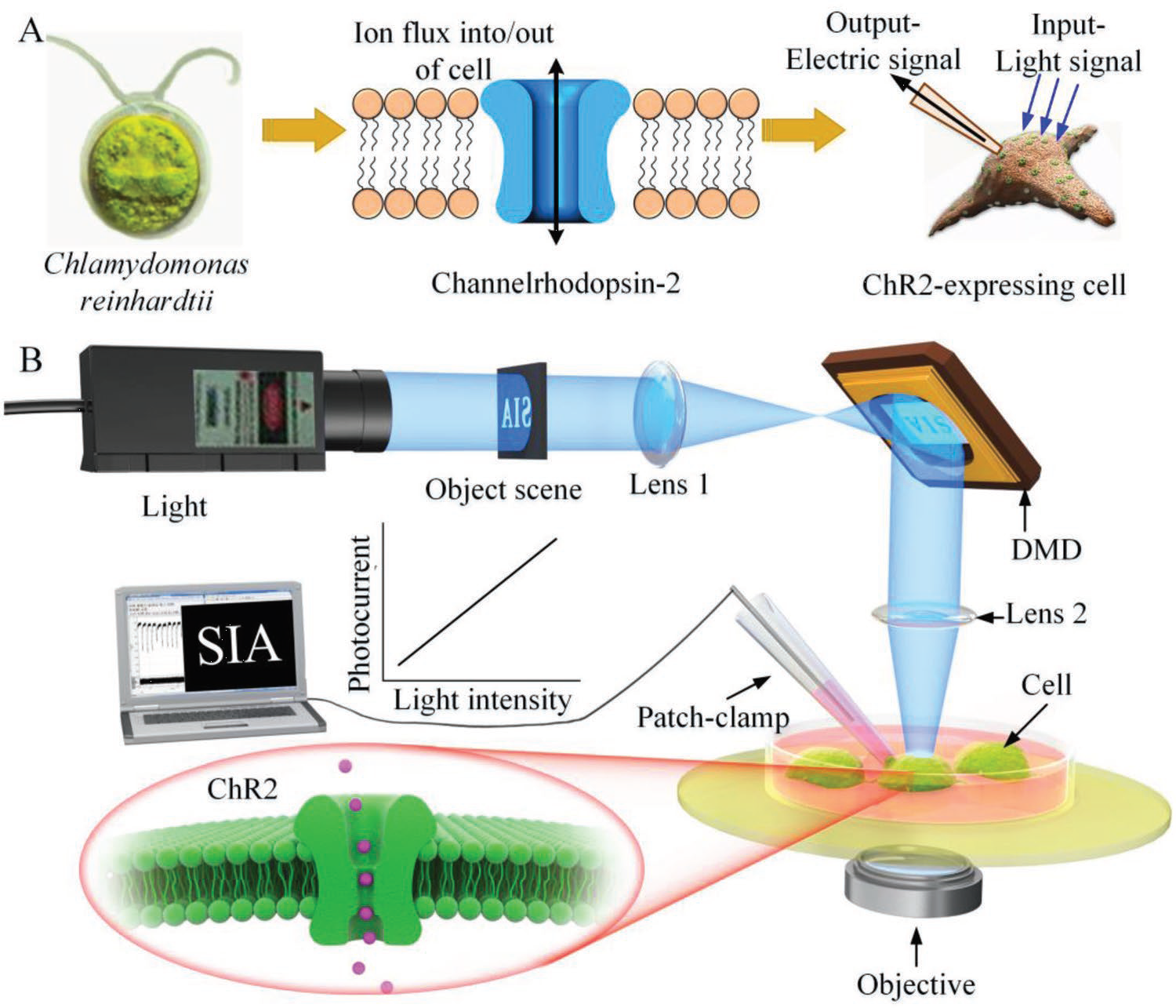 在題為Imaging with Optogenetically Engineered Living Cells as a Photodetector的研究論文中,微納米課題組科研人員在國際上首次利用光遺傳學工具實現了功能化細胞視覺感知成像:利用光遺傳學工具將來源于萊茵衣藻細胞的ChR2質粒成功轉染在Hek293細胞構建光敏細胞,并以此細胞為基礎建立類生命光電器件;利用單像素成像框架,構建了類生命視覺成像系統,實現了對宏觀字符的高清晰成像。該工作首次搭建了類生命視覺感知成像物理樣機,并用活體生物細胞成功實現了對宏觀目標的高清晰成像。此外,相對目前部分光電傳感器件,類生命光電器件在光敏感動態范圍、光強適應性等方面已經表現出了明顯的優勢。該工作不僅是在類生命機器人感知研究上新的探索和突破,也為未來在體視覺假體的發展提供了一種新的研究思路。