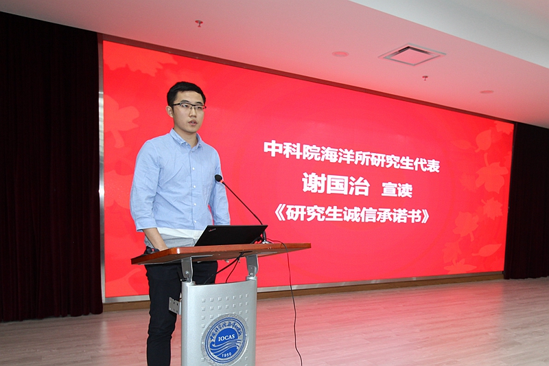 新職工代表田豐在發言中表示,一定會秉承海洋所的所訓所風,傳承老一輩科學家的優良傳統,刻苦鉆研、大膽創新,為研究所高質量發展和國家海洋事業發展努力奮斗。研究生代表王鑫同學表示,將傳承發揚老一輩海洋所人踏實勤勉、耕海探洋的精神,以“青春之我、奮斗之我”擔負起建設海洋強國的歷史使命。謝國治同學代表新入所研究生宣讀了《研究生誠信承諾書》,鄭重承諾要嚴格遵守各項規定,做有理想、有誠信的科研人。