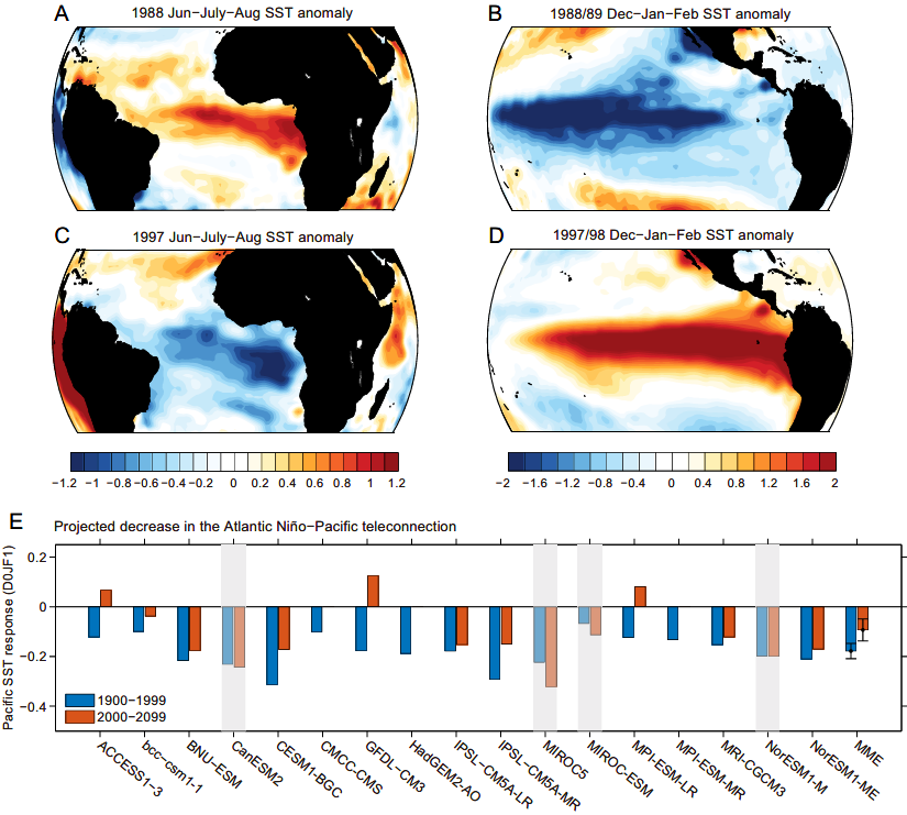 大西洋尼諾(也稱為大西洋緯向模態)是赤道大西洋年際變異的主模態,表現為年際尺度上赤道東大西洋海溫異常增暖(稱為大西洋尼諾)或變冷(稱為大西洋尼娜),且異常峰值出現在北半球夏季(6月-8月)。大西洋尼諾(尼娜)可通過加強(減弱)沃克環流,促進當年冬季太平洋拉尼娜(厄爾尼諾)的發展,從而成為厄爾尼諾-南方濤動(ENSO)的有效預測因子。極端ENSO事件因其海溫異常的強度大,會對全球氣候、生態系統和農業等產生顯著影響。而1900年以來的三次極端厄爾尼諾事件(1982/83、1997/98和2015/16厄爾尼諾),都伴隨有夏季的大西洋尼娜事件;兩次極端拉尼娜事件(1988/89和1998/99拉尼娜),也都與夏季的大西洋尼諾有關。隨著全球變暖,大西洋尼諾與太平洋及ENSO的關聯如何變化,目前尚不清楚。