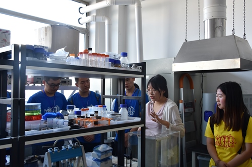 今年在研究生教育大廈一樓舉辦的研究部交流環節更是一場學術交流盛宴,各研究部通過海報展示了學術隊伍、科研設備、科研項目、研究生培養等各方面的豐碩成果,更有老師和師兄師姐們準備了紙質材料和PPT演示,與營員們面對面地深入交流,幫助大家了解各個研究方向,以便做出最適合自己的選擇。在研究部體驗環節,各研究室為同學們的到來做足了功課,詳細地介紹了各自研究室的基本情況、研究方向以及各自研究領域的最新進展。更重要的是,營員們有機會參觀一臺臺精密的實驗設備,親自動手完成一個個小實驗,感受神秘而真實的科研氛圍。實驗室里氣氛活躍而熱烈,營員們紛紛就自己感興趣的問題廣泛交流、深入探討。